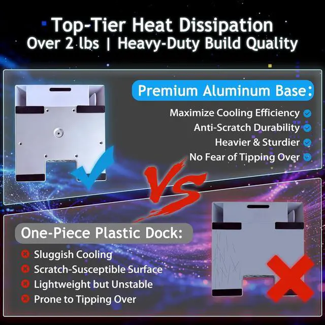 Aluminum Cooling Base Premium aluminum construction enables superior heat dissipation and scratch resistance, outperforming standard plastic bases that suffer from slow heat dissipation and easy scratching. With a heavier weight than plastic alternatives, this base stays firmly in place during use and prevents tipping, ensuring reliable stability for your console.