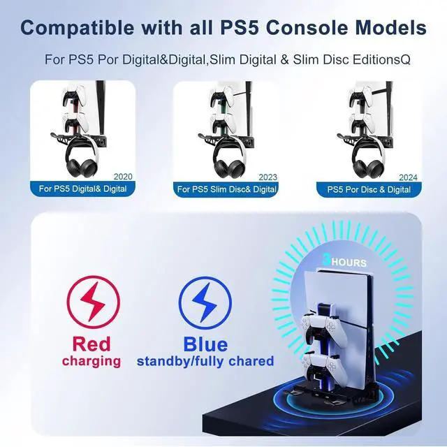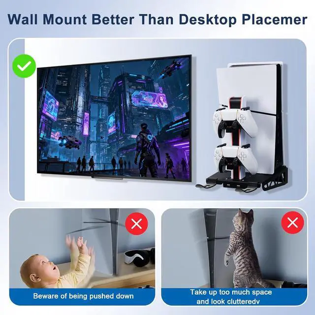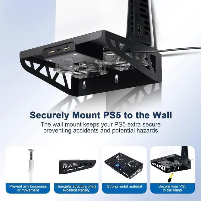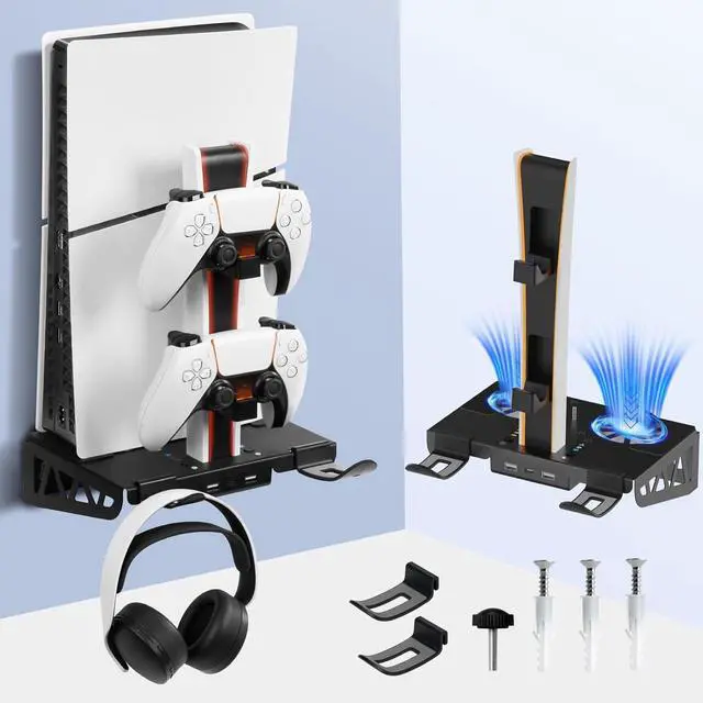 2 USB 2.0 Hubs& 2 Headset Hangers: The PS5 Pro Wall Mount has 2 additional USB ports for charging other devices and data transfer. The 2 extra headset hangers allow you to hang your PS5 headset and PSVR all in one place. Perfectly organize your PS5 console, DualSense controllers, and headphones on the wall to save space in your gaming room