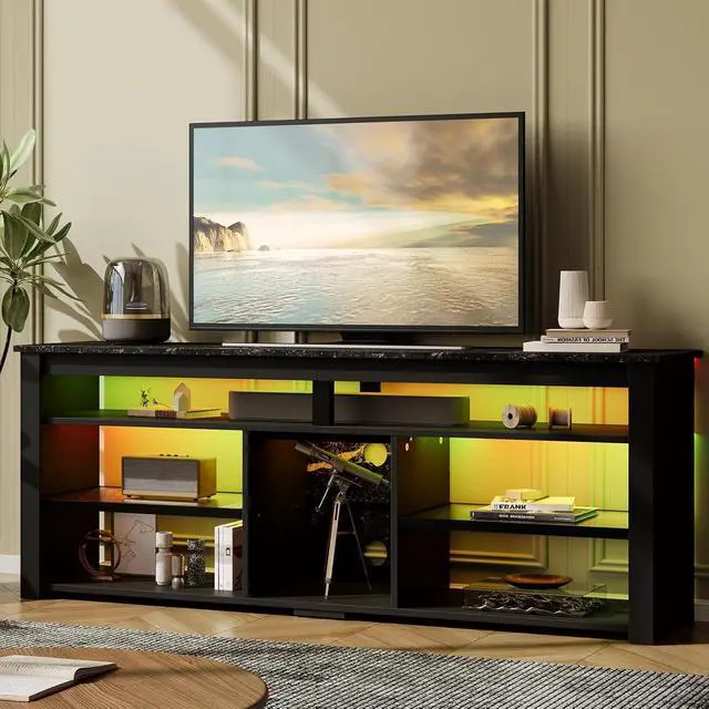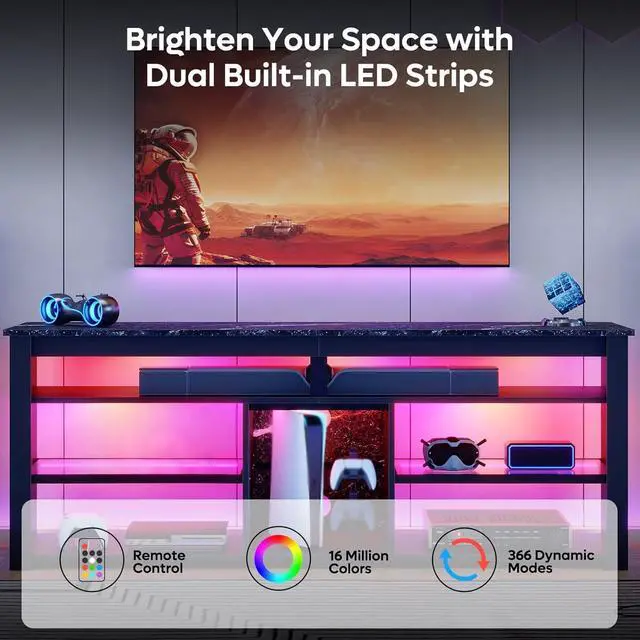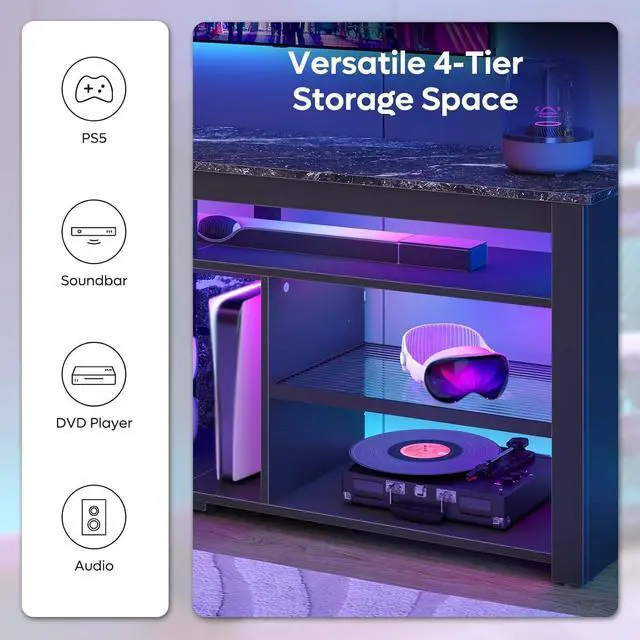 Spacious& Flexible Storage Space gaming entertainment center for PS5 has spacious open storage. Providing 6 ample storage compartments for your gaming devices, Xbox, soundbar, DVDs player, switchs, magazines, etc. The rear features 2 cable holes for efficient wire management, ensuring a tidy and organized space. Perfect for your living rooms, bedrooms and game rooms.