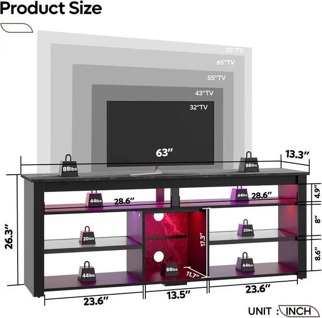 Dimensions& Weight Capacity63L x 13.3W x 26.3H -Suitable for 32 to 70 inch TVs. modern TV stand is made of high quality P2 particleboard, it not only has a strong load-bearing capacity but also more stable structure that can easily handle the weight of a large TV for long-term use.