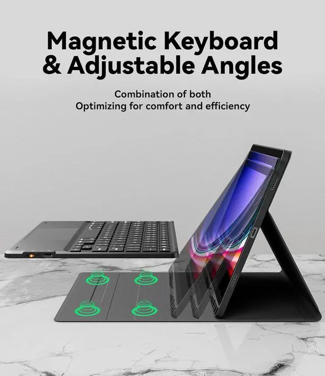 [Detachable Design]: The design is detachable, which means the keyboard or case can be used alone. The magnetic effect can fix the keyboard while typing. The protective case has 3 built-in card slots, which support angles of 110°120°and 130°, and you can adjust the viewing angle for a more comfortable viewing angle.