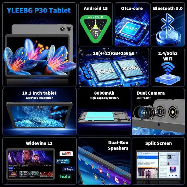 Large Battery & High-Speed ConnectivityThe 8000mAh battery with USB Type C ensures long-lasting use of the Android tablet, making it suitable for travel, travel and outdoor activities. In addition, 5G WiFi offers faster Internet speeds, allowing faster downloads, smoother streaming, and faster web browsing. This tablet is also equipped with Bluetooth 5.0 technology, which provides simple and flexible wireless connectivity. In addition, this electronic tablet supports wireless projection, which allows easy connection to a large TV