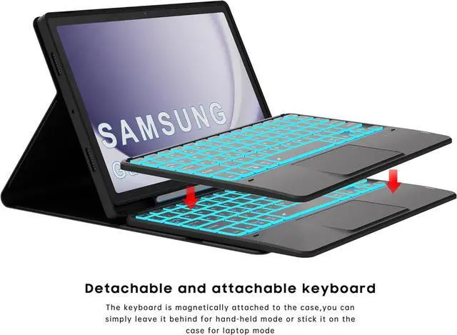 Detachable & Colorful Backlit Keyboard - This Tab A9 Plus tablet case with keyboard designed with 7 colors backlight with 3 level brightness to adjust, make it fun and easy to type in dark or at night. The removable keyboard and the leather case are magnetic. If not needed, you can remove it. Safe closed closure allows you to carry a tablet keyboard and hard shell with you. Convenient to carry, very suitable for travel and business