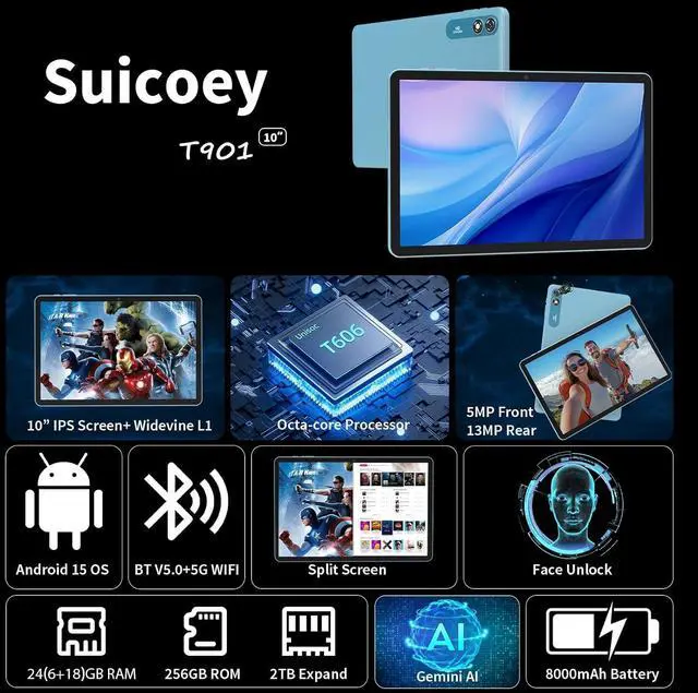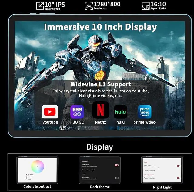 10 inch IPS Screen + Widevine L1 SupportThis AI tablet with keyboard bundle comes with a responsive 10-inch IPS screen featuring 1280x800 resolution, the android tablet 10 inch displays clear and natural images. This tablets 10 inch has Widevine L1 support and dual stereo speakers, providing an immersive viewing and listening experience. The android 15 tablet has a standard 3.5 mm headphone jack that allows you to connect wired headphones and enjoy high-quality, private audio
