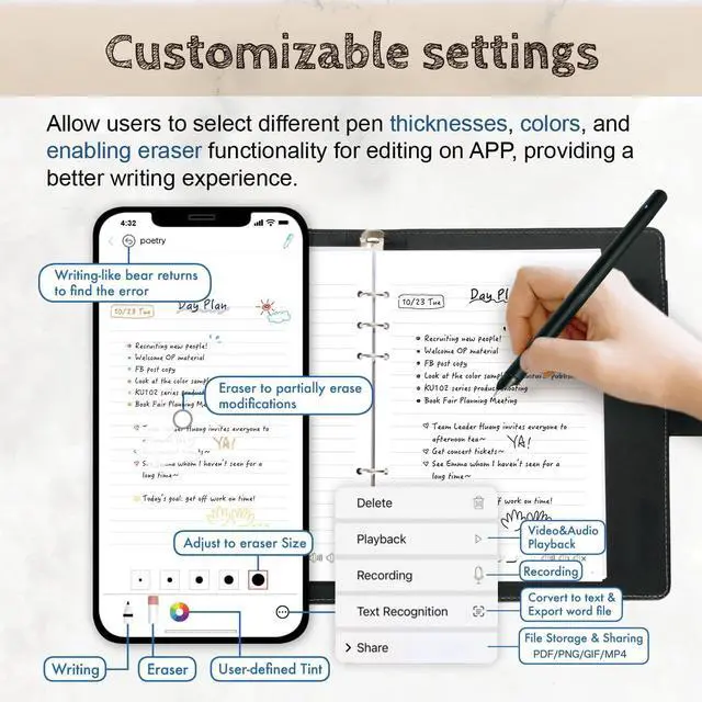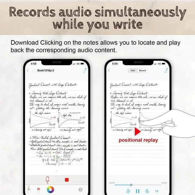 Record Audio FunctionThe digital smart pen for note-taking not only captures your written content, but also includes an audio recording feature. When connected to the app, it allows you to record audio with clear sound. This is particularly useful when you're unable to take notes or might miss important information during work or school. With the smart pen, you can record the audio by simply tapping the record button on your notebook or writing board to enhancing your work efficiency.