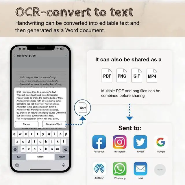 One-click Storage and Sharing smart digital pen for note-taking support multiple formats such as PDF, pictures, GIF, and MP4 (with recording capability). You can easily send and share your notes or creations via popular social media platforms like Facebook, Instagram, Twitter, and more. Additionally, you can directly send them via email or upload it to your preferred cloud storage services such as Dropbox and