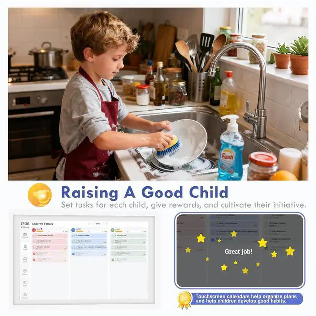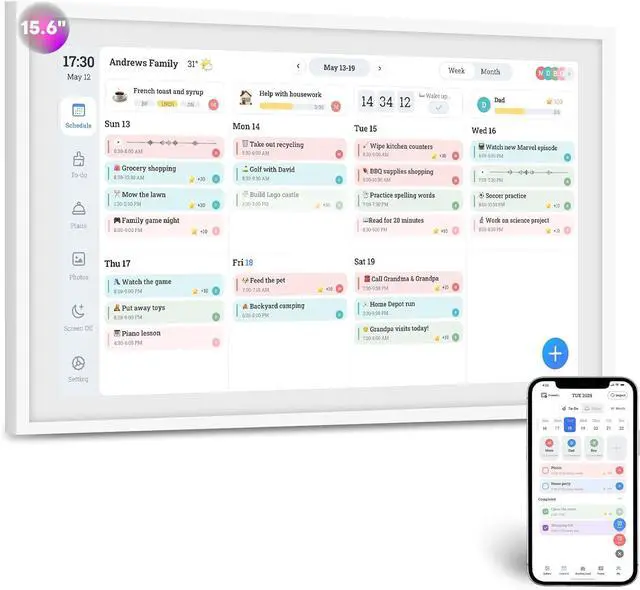 & Smart Calendar easily connects to Wi-Fi, and its dedicated mobile app (compatible with iOS and Android) allows for real-time management of all functions. Upload photos, videos, or voice greetings instantly, and keep your loved ones updated in real time. The device syncs seamlessly with Google, iCloud, Outlook, Yahoo, Cozi, and TeamSnap calendarsso your family always stays organized and connected.