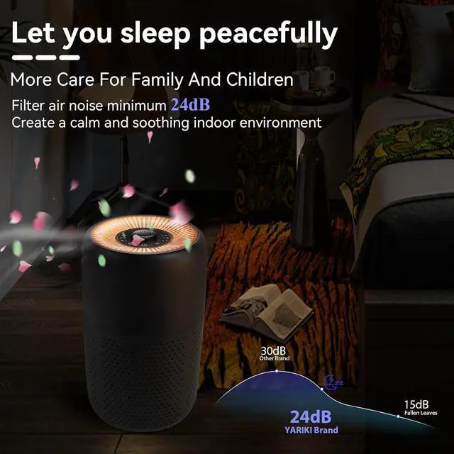 Night Light: P60 Bedroom Air Purifiers Equipped with soft night light function and 24dB ultra-low sound. Just touch the button, the warm and non glaring night light will light up gently, creating a warm and peaceful atmosphere. At the same time, its excellent silent technology ensures almost no noise during night work, without disturbing your rest. Whether used in the bedroom, children's room, or elderly room, it allows you to enjoy fresh air while having sweet dreams.