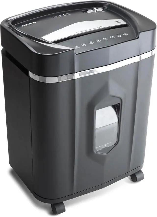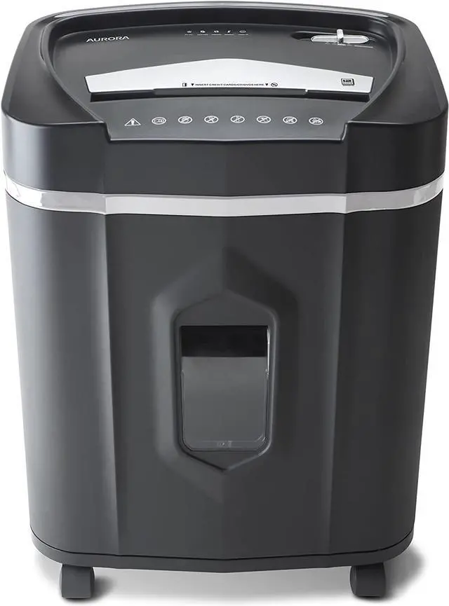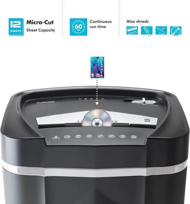 The high security 12-sheet micro-cut paper, CD and credit card shredder with a 5.0 -gallon pullout basket is the perfect business and home office device to keep you safe from identity theft. It accepts up to 12 sheets of paper at a time and shreds them into small pieces (5/32 by 15/32 inches), security level P-4. The throat of the shredder is 8.7 inches wide and allows continuous shredding for 60 minutes.