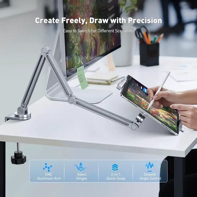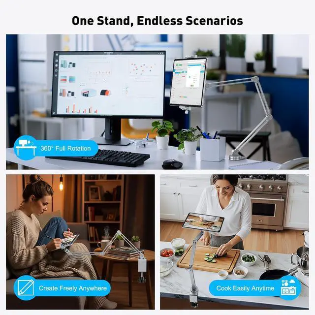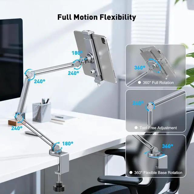 FLEXIBLE ANGLES & PRECISE ADJUSTMENTS: This iPad desk mount offers a 25.7" reach with multiple joints: two 7.95" arms and a 6.5" center arm adjust up to 240°, plus a 180° base tilt and 360° rotation. Smooth hinges ensure portrait or landscape stability, making it the perfect tablet stand for desk for drawing, teaching, video calls, or kitchen use.