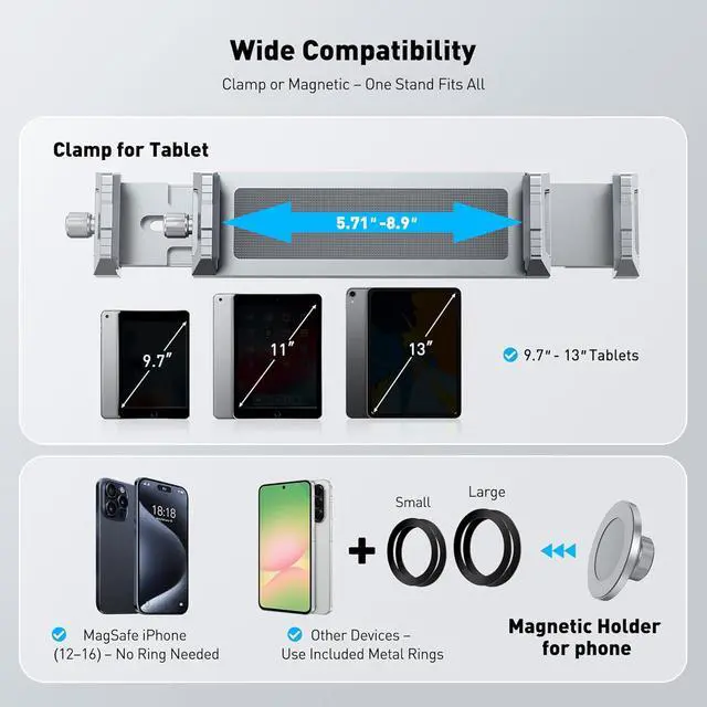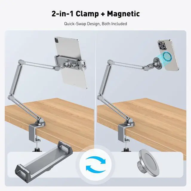 HEAVY DUTY STABILITY & MAGNETIC POWER: Crafted from CNC-machined aluminum, this iPad holder for desk features a three-stage arm that supports up to 2.2 lb / 1kg without sagging, ensuring long-lasting stability for tablets and portable monitors. The upgraded magnetic head delivers a powerful grip, keeping phones and tablets securely in place during work, drawing, or streaming. A rugged iPad clamp mount built for offices, studios, and pro users.