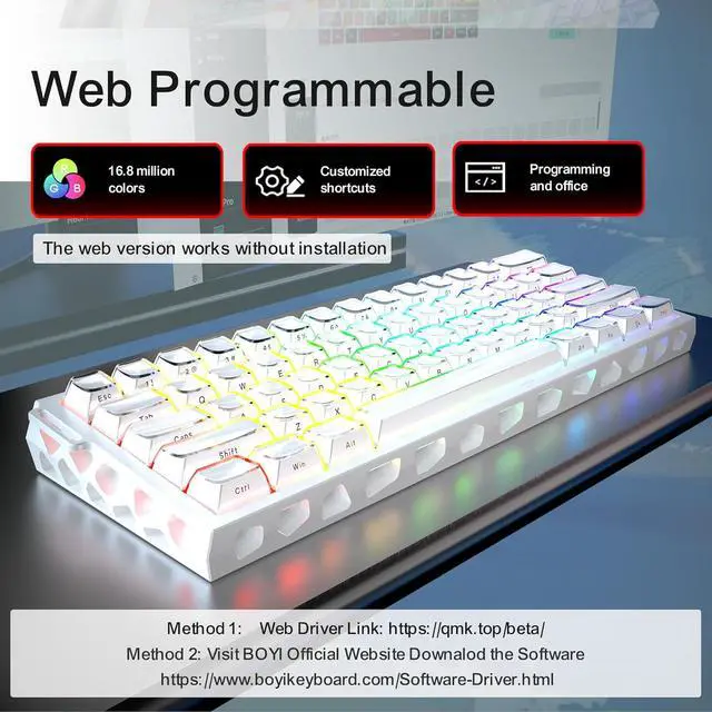Dual Driver for PC/Web Page: This programmable keyboard support Customization on Web Driver, no need to download software. H60Pro keyboard has a web for both Win/Mac, allowing for extensive customization of RT adjustment, key combinations, macros, reassign keys, efficient and convenient setting of performance parameters, light effects, hotkeys, and support for on-board memory. Please download driver on official website