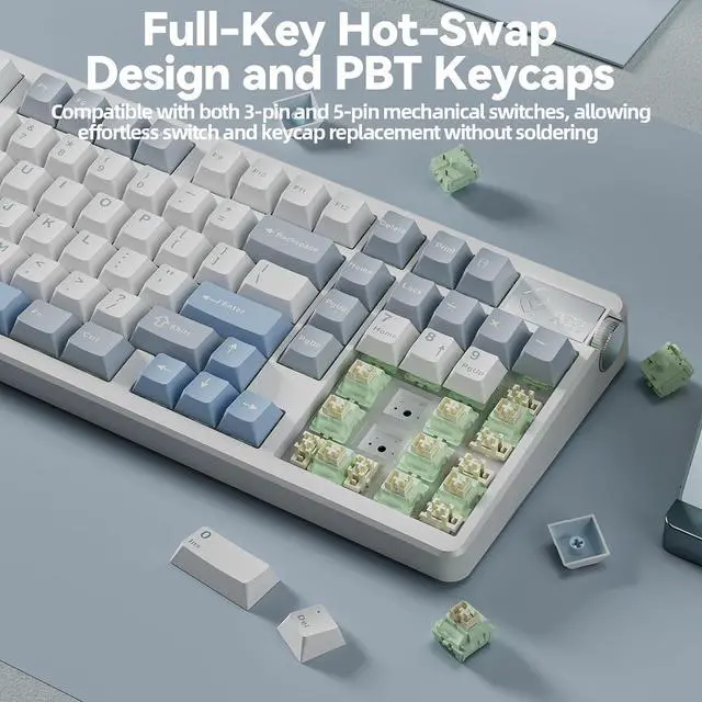 Double-shot PBT Keycaps: Featuring double-shot PBT keycaps that resist shine and fading, this mechanical keyboard maintains its look over time. The compact 96% layout saves space while keeping the number padideal for both data entry and gaming. With a built-in 8000mAh battery, this wireless keyboard delivers weeks of use on a single charge. Whether you're using it as a travel-friendly wireless keyboard or a powerful gaming keyboard, its ready for anything. This keyboard is built for lasting durability.