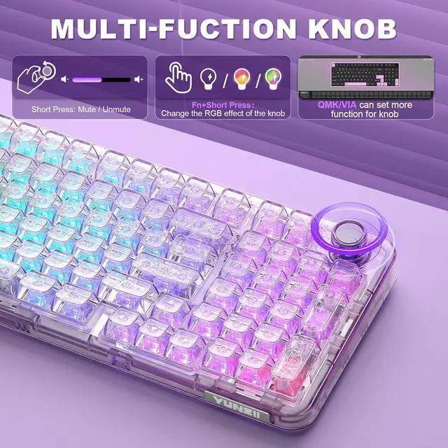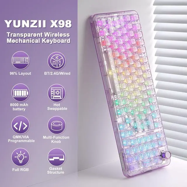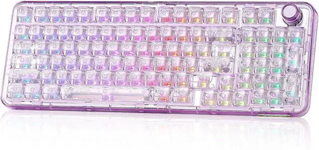 Crystal Clear Keyboard with Vibrant RGB: X98 transparent keyboard crafted from high-transparency PC material, the clear casing and shine-through keycaps maintain purity and clarity. Double-layer clear keycaps not only keep the crystal aesthetic appeal but also ensure anti-fading of keycaps characters. The RGB keyboard featuring with south-facing LEDs and 16.8 million colors, light up your gaming setups!