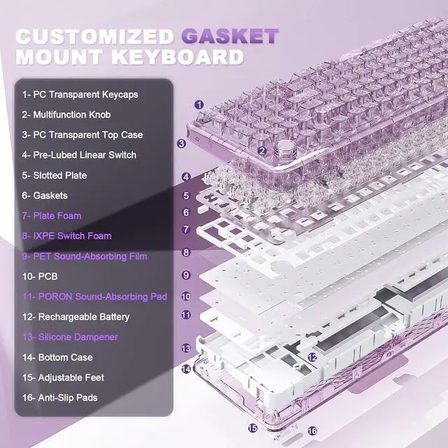 Gasket Mount Keyboard with Satisfying Sound: Experience a milky, creamy acoustic profile with X98 gasket mount keyboard, which composed with 5 layers of dampening materials (Poron, IXPE, Silicone, and Sound Enhancement Pads). The gasket structure of the PC gaming keyboard better optimizes resilience and stability, offering a softer, more elastic hand feel with a solid keystroke response.