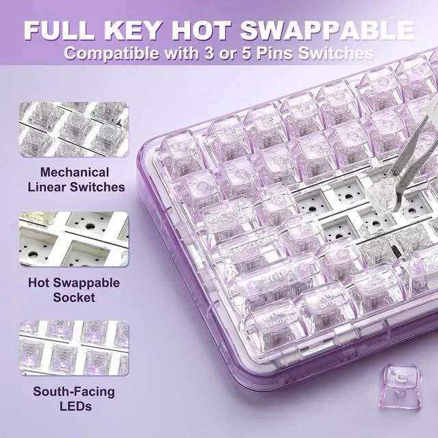Pre-lubed Switches: X98 Custom keyboard features a hot swappable socket compatible with 3-pin and 5-pin mechanical switches. Equipped with pre-lubed Snow Switches, the pre-lubed switches of the creamy mechanical keyboard offers silky-smooth, creamy typing and quiet actuation, perfect for users who wants out-of-box creamy and reliable performance.