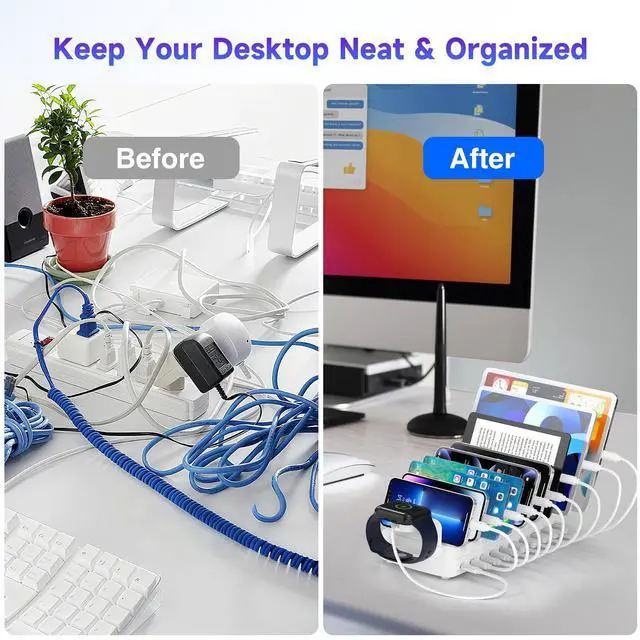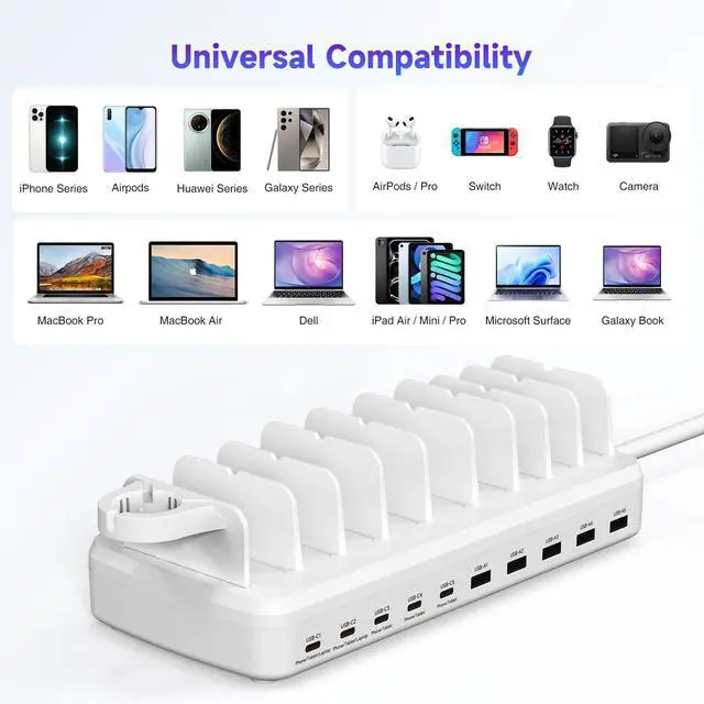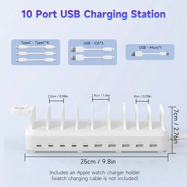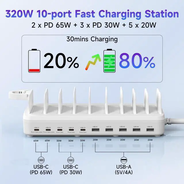 Powerful PD USB-C Fast Charging PortsOur multi-device charging station is equipped with 2 65W and 3 30W PD USB-C and 5 USB-A fast charging ports, which provide lightning-fast charging speeds and can boost your phone's power from 20% to 80% in 30 minutes, giving you a more efficient charging experience. It also includes an Apple watch charger holder (watch charging cable is not included).
