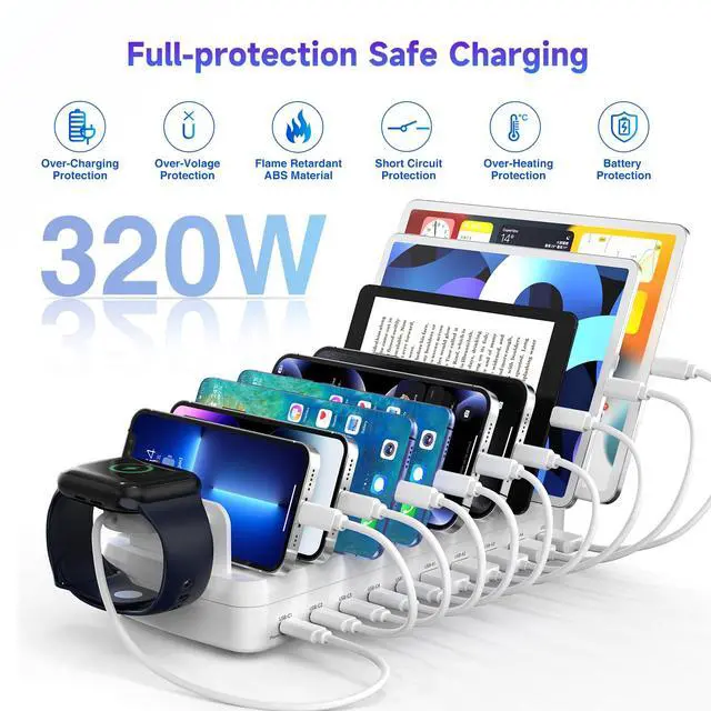 320W Charging Station for Multiple Devices, 10 Ports Fast Multi-Device Charger Organizer Compatible with MacBook Pro Laptop, iPhone, Android, Ipad, Tablet, Kindle, Family Multi-Device Charging Dock