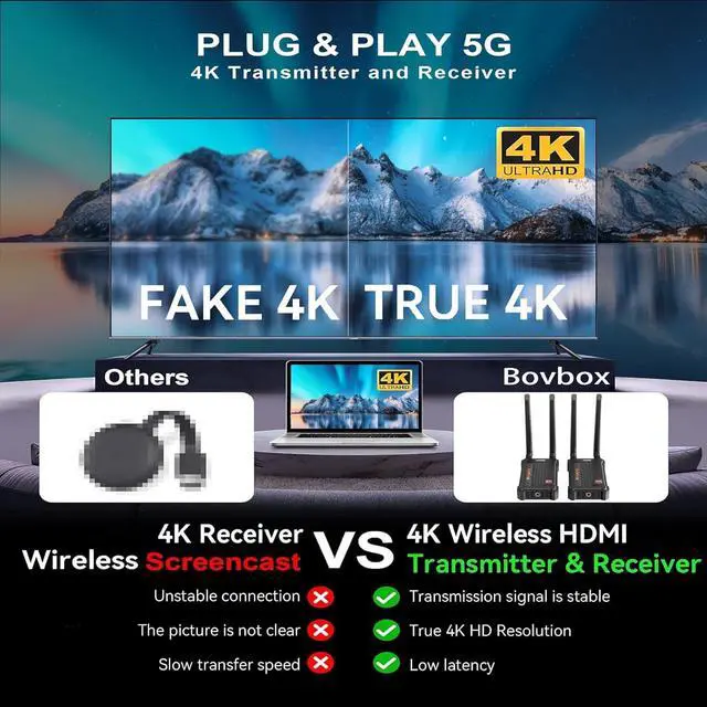 True 4K Transmitter and ReceiverDifferent from the equipment on the market, BovBox HDMI Wireless Transmitter and Receiver is for 4K hardware decoding, enabling wireless transmission of 4K HDR video and audio. At the same time, if you use it to transmit 1080P video, you will get a more stable and lower latency experience