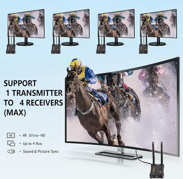 Support 1TX to 4RXs (Max) With the Wireless Video Transmission Systems, allows you have up to four receivers bound to one transmitter. As RX increase, the wireless transmission distance will be shortened. 1 TX to 1RX up to 490FT; 1 TX to 2RXs up to 262FT; 1 TX to 3RXs up to115FT; 1 TX to 4RXs up to 65FT
