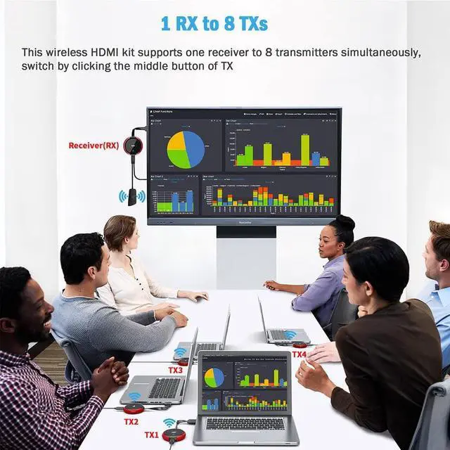 Suitable for conference rooms, home entertainment, and multimedia educationMULTIPLE TRANSMITTERS & SCREEN MIRROROur HDMI wireless extender allows for pairing 1 receiver with up to 8 TXs. 1 clicks to disconnect and 1clicks to connect, making it ideal for an important meeting. Our receiver enables wirelessly screen mirroring from Android phones, tablets, i-Phone, i-Pad to TV/ monitor/ projector using protocols like Miracast, DLNA, and Airplay. Customize the startup interface, switch between portrait and landscape modes, modify account names and passwords, and adjust channel settings