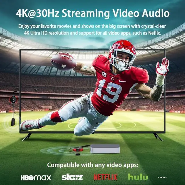 4K@30Hz HOME THEATER EXPERIENCEThis wireless HDMI transmitter and receiver kit have a resolution of 720p, 1080p, and 4K. You can enjoy the most realistic and immersive experience on a 4K compatible big screen. Add a new feature to your old TV! With this HDMI extender, you can cast all apps you know, like Net-flix, Hulu+, Dis-ney+. Transform your living room or backyard into a captivating home theater165FT/50M WIRELESS TRANSMISSIONUtilizing a 2.4G /5G transmission protocol, the signal is stronger and more stable, extending the transmission range up to 165FT/50 meters in line of sight.