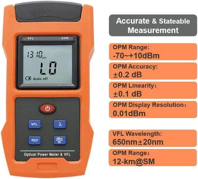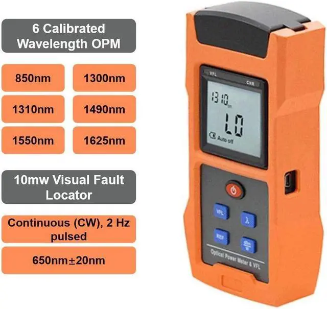 It can test optical power within the range of 800~1700nm wavelength, ensuring high measuring precision of 850nm, 1300nm, 1310nm, 1490nm, 1550nm, 1625nm, six calibrated wavelengths.