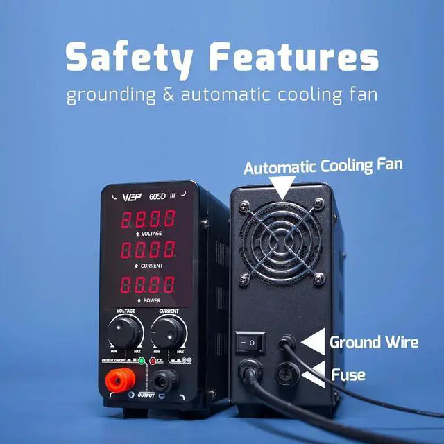 This dc power supply comes with short-circuit protection, active temperature management, overload protection (CC/CV mode), The power supply cuts power, play a warning beep, and shows code "ScP" when a short circuit is detected. The cooling fan activates automatically to maintain optimal operation temperature, and the adjustable power supply cuts power and enters protection mode once overheat is detected.