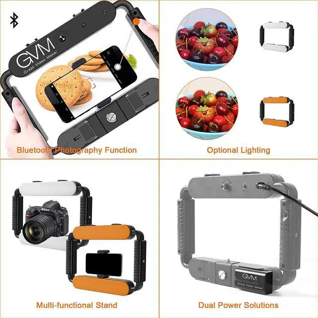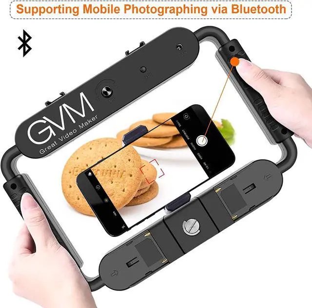 [Bluetooth Photography Function] Turn on the Bluetooth function on the mobile phone and connect GVM-HL. You can take photos with the mobile phone via the Bluetooth Photographing Button. (the camera and mobile phone of the product images are not included in package)