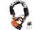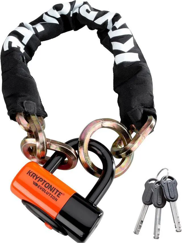 12mm six-sided, chain links made of 3t HARDENED MANGANESE STEEL for maximum strength. CINCH LOOP for effective lock-ups using less chain. Offers nearly the same in-use length as a traditional 3.5 chain, which means less bulk to carry. Durable, protective nylon cover with hook-n-loop fasteners to hold in place. Includes Evolution series 4 Disc Lock with 14mm MAX-PERFORMANCE STEEL SHACKLE. HIGH SECURITY DISC-STYLE CYLINDER with reinforced anti-drill, anti-pull protection system. Patented*, oval hardened STEEL CROSSBAR for extra security. Hardened DOUBLE DEADBOLT locking for extensive holding power. SLIDING DUSTCOVER protects and extends cylinder life.