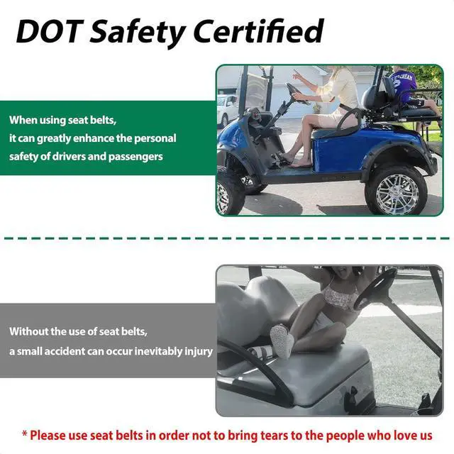 DOT Certification: Golf cart seat belts are certified by the U. S. DOT for safety. Can be used legally on city streets.
