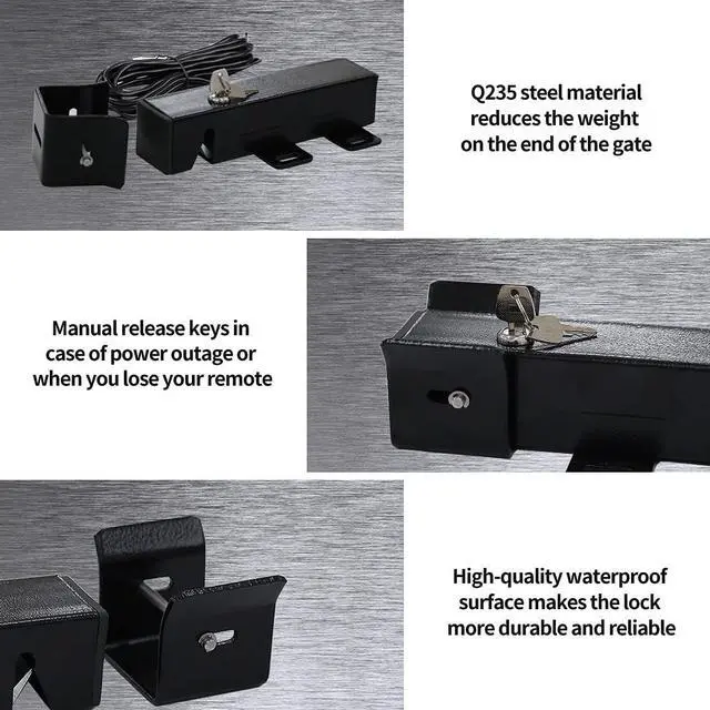 Safe to Use - The electric lock adds reinforcement to prevent against unwanted intrusion on gate systems. Weather-resistant for all seasons of the year. Manual Keys are included to enable manual operating during power outage or when you lose the remote. Higher quality designed plastic-spraying surface makes the lock more durable and reliable.