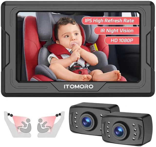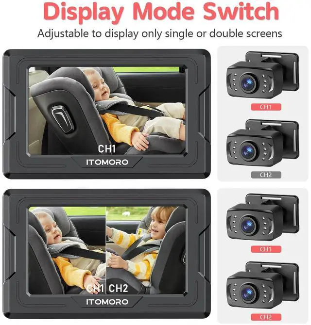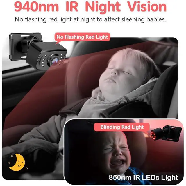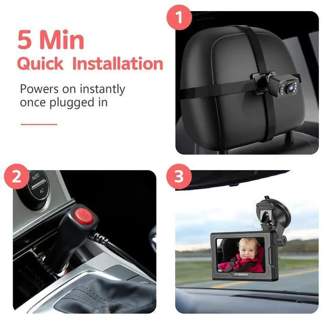 EASY TO INSTALL & STABLECar camera for baby simply straps to the headrest where car baby camera can be easily adjusted. Install the displayer, connect power supply, then it works. Displayer Automatically Turns On and Switch To Baby Backseat. The one-piece base with Velcro elasticated straps saves you from car shaking during driving and gives you the ultimate driving experience.