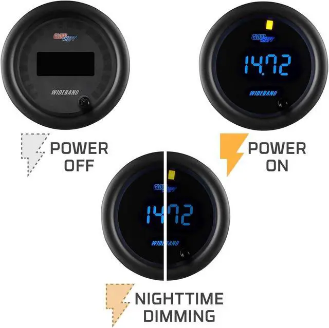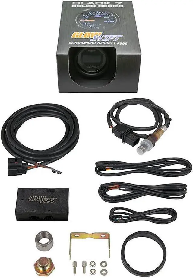 Includes 4.9 LSU Wideband Oxygen Sensor, Weld-In Bung, Control Box, 10' Sensor Harness, 7' Gauge to Control Box Harness, 5' Power Harness, 3' Data Logging Wire, Gauge Visor, Mounting Hardware & Installation Instructions