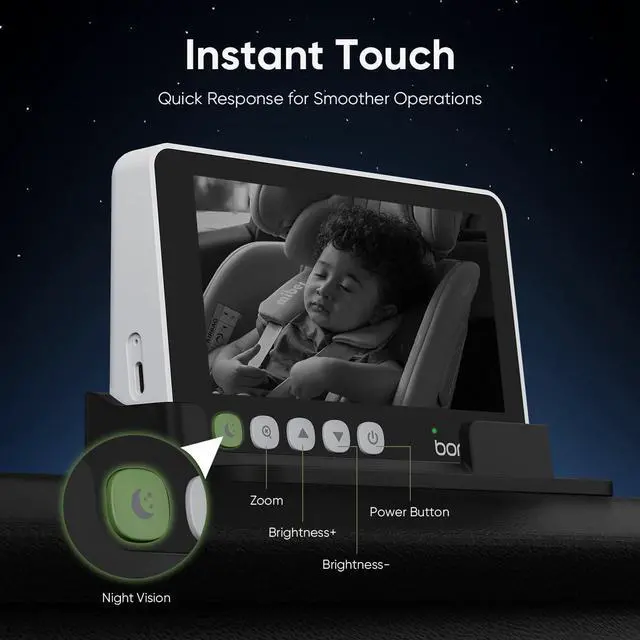 Automatic Night Vision: The backseat camera for your baby comes with advanced RGB-IR technology for night vision; With one tap, it delivers clear black-and-white images even in unstable nighttime lighting, without switching between day and night modes, ensuring consistent and clear monitoring
