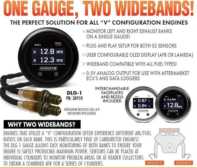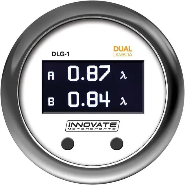The Innovate Motorsports DLG-1 Dual Lambda Gauge is two widebands in one! This 52mm (2-1/16") gauge can simultaneously monitor and display data for two Wideband O2 sensors making the the perfect solution for V and Boxer engines with multiple cylinder banks. Includes Innovate MTS serial comms for use with MTS enabled devices to add additional logging channels for analysis with powerful LogWorks PC software.