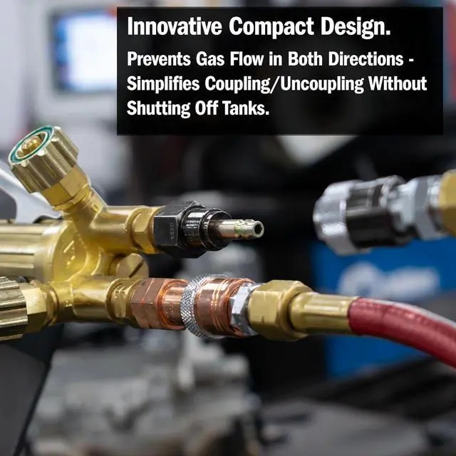 The compact design prevents gas flow in both directions when disconnected, eliminating the need to turn the tanks off when coupling and uncoupling.