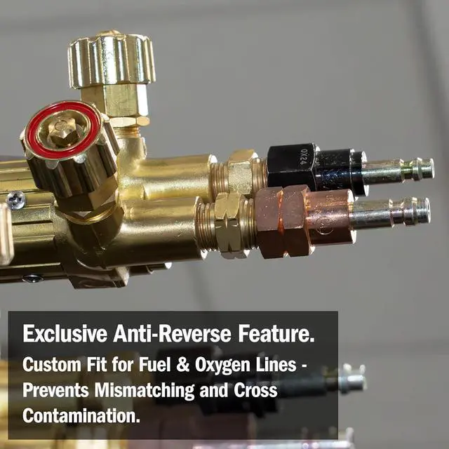 The Anti-Reverse feature eliminates the risk of mismatching the fuel and oxygen lines, preventing dangerous cross contamination of gases.
