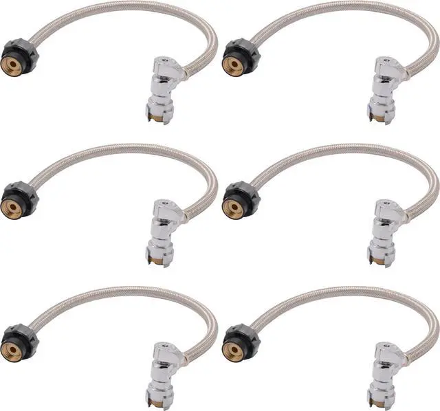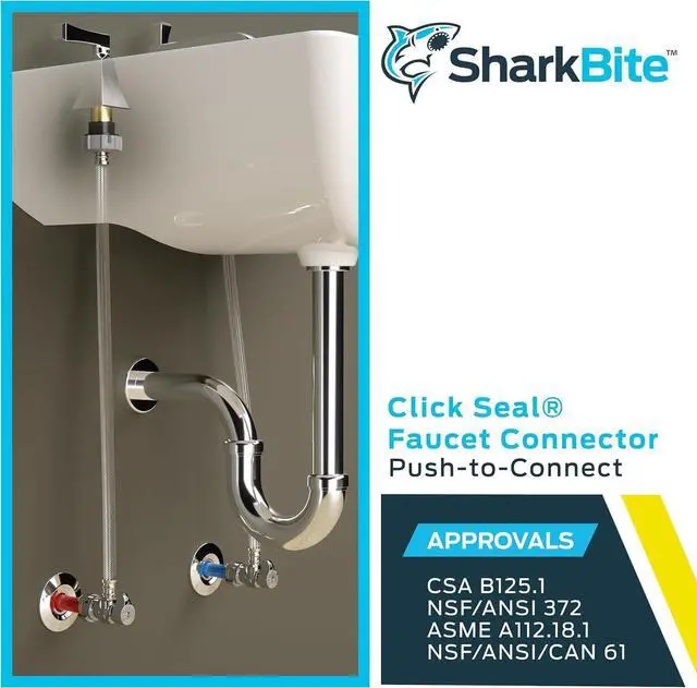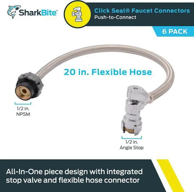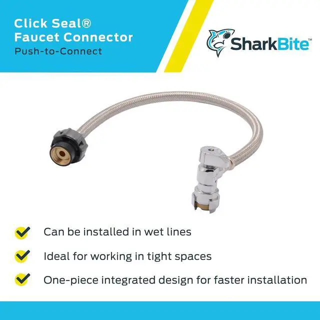 Simplify your plumbing projects with the SharkBite Click Seal faucet water supply connector. The push-to-connect mechanism of this plumbing fitting ensures a watertight and leak-free connection. This brass faucet coupling is ideal for working in tight spaces and can be installed in wet lines. These faucet supply line connectors are easy to install, compatible with PEX, CPVC, PE-RT, SDR-9 HDPE, and copper pipe, and do not require any special tools, glue, crimping, or soldering for installation. These faucet water line connectors that feature a 1/2-inch push-fit stop valve and a flexible hose with a Click Seal faucet connector are suitable for commercial repairs or home improvement projects. All SharkBite valves, clips, joints, and adapters are manufactured and tested in the USA.