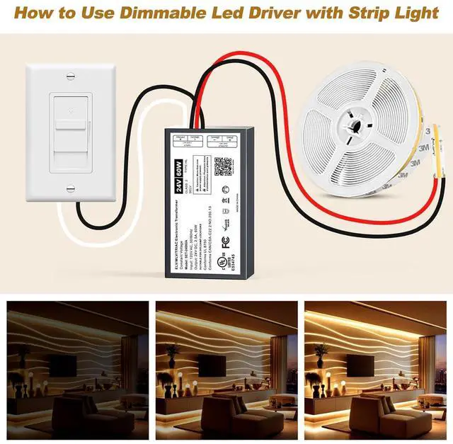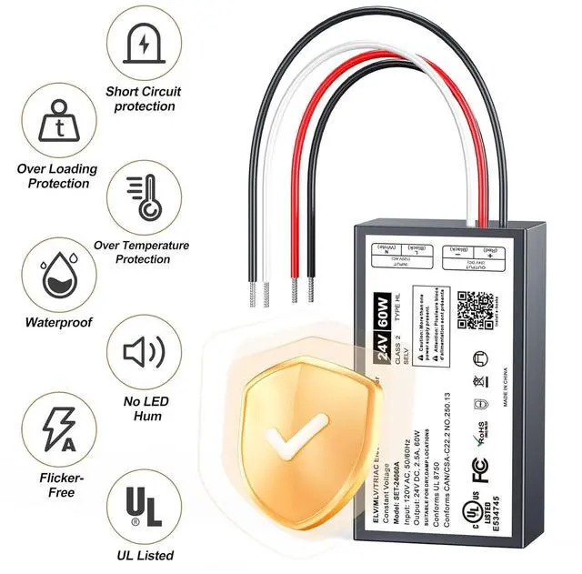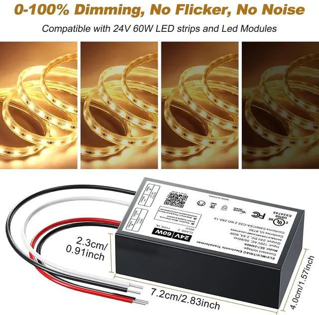 Safety & High quality dimming: Our 24V 60W dimmable transformer is one of the safest transformers on the market. Built-in protections include Short Circuit/Over Loading/ Over Temperature protection. Ensuring the safety of both the driver itself and your project. You can have peace of mind knowing that your lights and installation are protected.