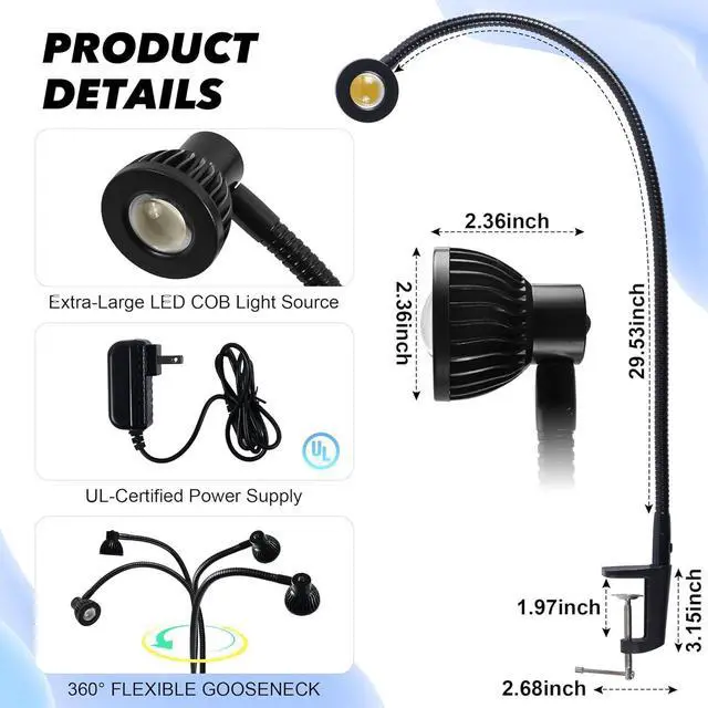 All-metal manufacturing, excellent heat dissipation structure,unique design, extremely durable, super durableG metal clip 5w led tool lamps, All Aluminum lamp head, Iron Gooseneck arm, 2m long cable, 110v US plug,UL list