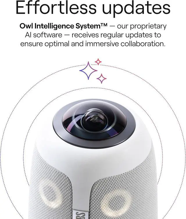 SMALL TO LARGE ROOM COVERAGE. The flexibility of the Owl Labs ecosystem is unmatched. Pair two Meeting Owls, a Meeting Owl and an Owl Bar, or add an Expansion Mic to expand video and audio reach in larger spaces. Compatible with Owl Labs Whiteboard Owl to complete your hybrid room setup.