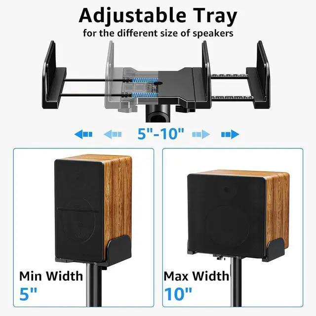 STURDY AND STABLE: The pole and base of this model are made of durable heavy-duty alloy steel with black powder coated in a high-end satin finish. The base is very stable for a size of 9.8" x 9.8". It has passed our strength and safety test to ensure the security of your speaker before launch. It could hold up to 11 lbs each with ease. We provide rubber foot pads for tile/wood floors and metal nails for carpets to adapt to all scenes with stability