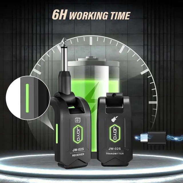 Long Battery Life: Wireless guitar transmitter and receiver bulit in rechargeable battery up to 6 hrs working time after fully charged