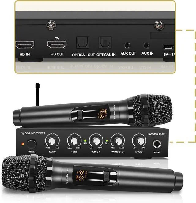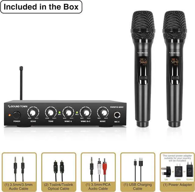 TWO IN ONE: The wireless microphone receiver is also a sound mixer and equipped with rotatory controls which allow you to adjust echo, tone and volume of the mics; Its ideal for conferences, broadcasting, weddings, karaoke, social events and any small to medium-sized venues such as meeting rooms, auditoriums, schools, churches and small stages.