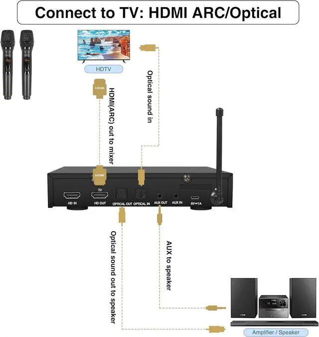 CONNECTION DIAGRAM: 1. To use this product via the TV connection, refer to the picture of Connection Instructions, enable your TVs ARC function, PCM setting and choose external speakers in the TV settings. 2. If you are experiencing little to no volume for the mics, turn the volume much higher on your TV, Sound Bar, and Receiver; then on the SWM16-MAX mixer, turn the volume knob low to mid level (20%-30%).