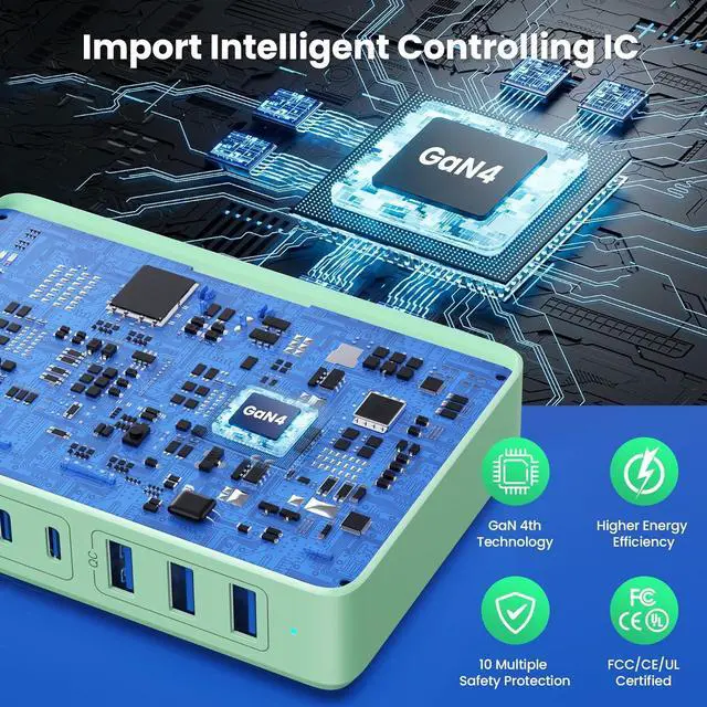 Compact Design & Import ligent controlling IC: Small size ensure maximum portability wherever you go. built-in safeguards protect your devices against excessive current, overheating, and overcharging. High-quality ABS and PC fireproof materials ensure the safety of your devices. multiport GaN IV charger PASS UL, FCC, CE, ROHS safety certification. Your safety is our duty.