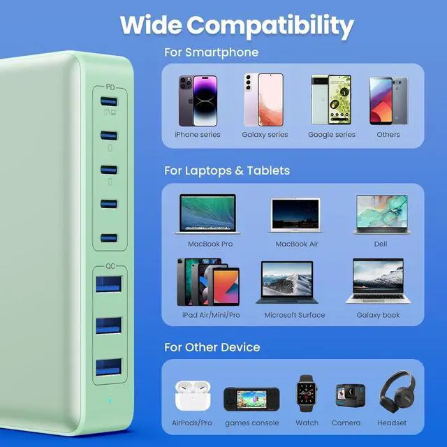 Universal Compatibility: Our charging hub has great charging capabilities, with a total of 300W high wattage, it supports various types of devices. for Macbook Pro 13'' 15'' 16" Air 13" 12",, HP, Surface(USB-C devices, for iPhone 16 15 14 13 Plus Pro Max, iPhone 12 11 Mini Pro Max; for iPhone XS XS Max XR; Samsung Galaxy S24 S23 Ultra S22 S21 Note; for iPad Pro Air Mini; Air--pods, Switch, Watch etc.