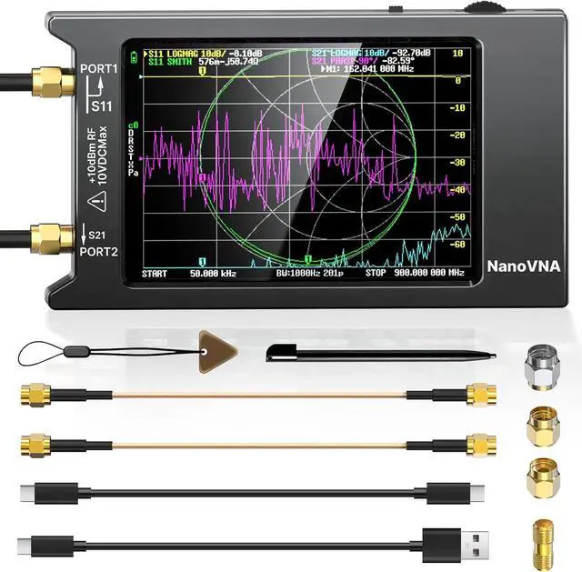 [WHAT ARE INCLUDED] 1x NanoVNA-H4 host (with 1950mAh battery), 4pcs SMA male calibration kit (open/short/load/SMA female to female connector), 2x 16cm/ 6.3 inch SMA male to male RG174 RF cable, 1x USB Type-C data cable, 1x Type-C to Type-C cable, 1x Lanyard with stylus, 1x stylus pen, 1x User Manual