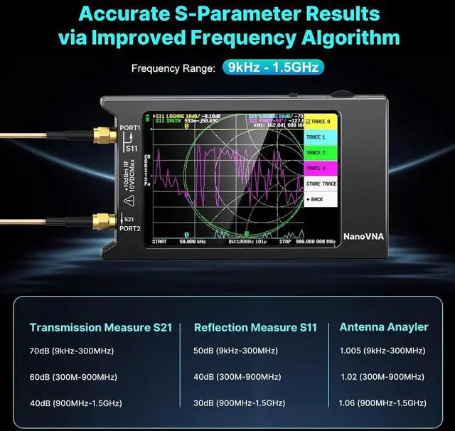 [ANTENNA PERFORMANCE MEASUREMENT] The default firmware main function for vna analyzer is used for antenna performance measurement. It has good RF performance for S-parameter measurements as previous models. It is very efficient vector testing for ham radio operator, research electrical engineer and antenna builders.